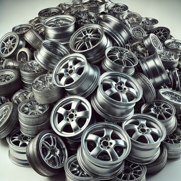 These are used, slightly corroded wheels commonly recycled as aluminum scrap. These alloy wheels, featuring a mix of shiny and weathered surfaces, are a valuable source of recyclable material used in various industries.